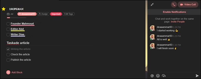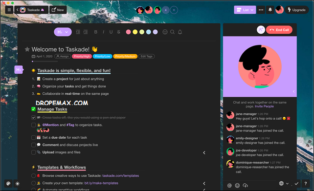 يركز البرنامج على جعل كل شيء مركزيًا ويسهل الوصول إليه، كما يحتوي مساحة عمل افتراضية حيث يمكن لكل عضو في الفريق إنشاء مهام أو قوائم مهام بالإضافة إلى رؤية جميع المهام لليوم وبقية الأسبوع والتعاون بين الزملاء والدردشة معهم بكل سلاسة. بشكل عام، يمكنك النظر إلى Taskade على أنه دمج بين أداة Trello و OmniOutliner و OmniFocus تحت سقف واحد! والذي قد يكون شيئًا جيدًا لتلبية كافة احتياجاتك.