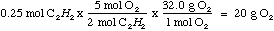 Then, because there are five (5) molecules of oxygen to every two (2) molecules of C2H2, we need to multiply the result by 5/2 to get the total molecules of oxygen. Then we convert to grams to find the amount of oxygen that needs to be added: